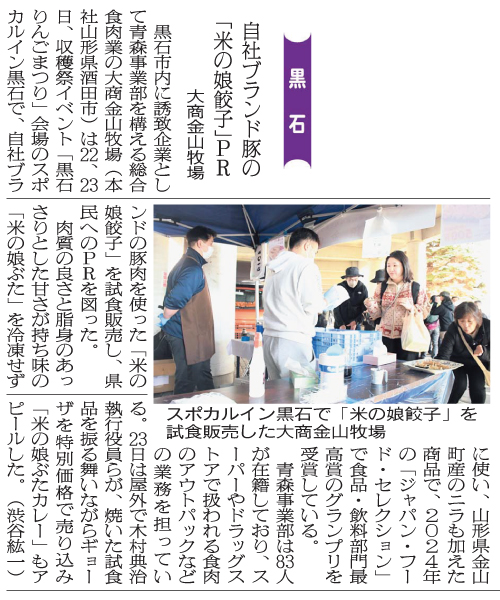 お知らせ ホームお知らせ第34回黒石りんごまつりに参加した当社青森事業部の様子が陸奥新報に掲載されました 第34回黒石りんごまつりに参加した当社青森事業部の様子が陸奥新報に掲載されました 2025/12/02 陸奥新報 2025/11/25 11月22日・23日開催の「第34回黒石りんごまつり」に参加した青森事業部の様子と、 米の娘餃子の紹介が11月25日の陸奥新報にて掲載されました。 一覧を表示 お知らせ 20252024202320222021202020192018