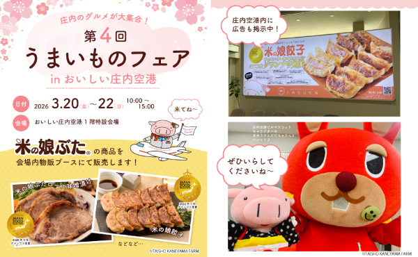 お知らせ ホームお知らせ3/20〜3/22 イベント「第4回うまいものフェアinおいしい庄内空港」に参加します! 3/20〜3/22 イベント「第4回うまいものフェアinおいしい庄内空港」に参加します! 2026/03/17 3月20日(金)〜22日(日)に庄内空港にて開催される「第4回うまいものフェアinおいしい庄内空港」にて米の娘ぶたのおいしい商品を販売いたします! ジャパン・フード・セレクションでグランプリを受賞した「米の娘餃子」「米の娘ぶたロース味噌漬け」をはじめ、 米の娘ぶたのおいしい商品をたくさんご用意いたしました! ぜひお越しください! 庄内空港ビルホームページ https://www.shonai-airport.co.jp/notice/post-8107/ 一覧を表示 お知らせ 202620252024202320222021202020192018