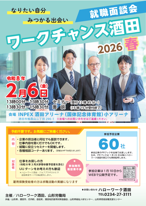 2/6 INPEX酒田アリーナ(国体記念体育館)にて行われる就職面談会「ワークチャンス酒田2026春」に参加します